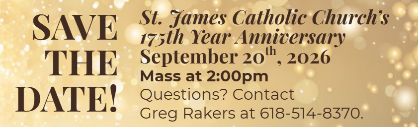St. James Catholic Church is celebrating its 175th anniversary on September 20th, 2026, with a Mass at 2:00 PM. If you would like to join the planning committee, please contact Greg Rakers at 618-514-8370.